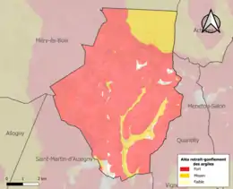 La commune est vulnérable au risque de mouvements de terrains constitué principalement du retrait-gonflement des sols argileux[15]. Cet aléa est susceptible d'engendrer des dommages importants aux bâtiments en cas d’alternance de périodes de sécheresse et de pluie. 97,8 % de la superficie communale est en aléa moyen ou fort (90 % au niveau départemental et 48,5 % au niveau national). Sur les 324 bâtiments dénombrés sur la commune en 2019, 305 sont en aléa moyen ou fort, soit 94 %, à comparer aux 83 % au niveau départemental et 54 % au niveau national. Une cartographie de l'exposition du territoire national au retrait gonflement des sols argileux est disponible sur le site du BRGM[16],[Carte 2].