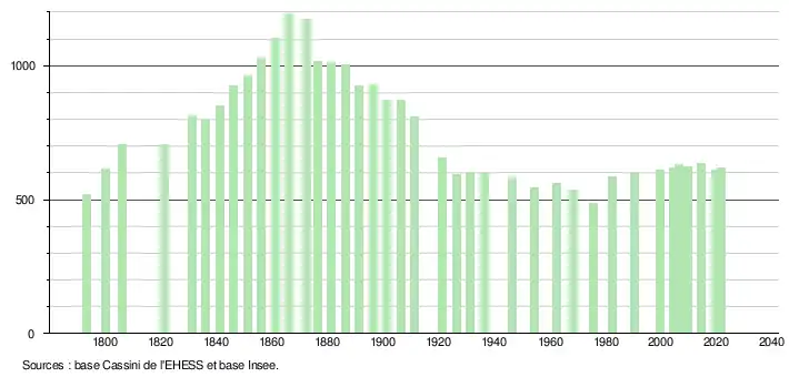 L'évolution du nombre d'habitants est connue à travers les recensements de la population effectués dans la commune depuis 1793. Pour les communes de moins de 10 000 habitants, une enquête de recensement portant sur toute la population est réalisée tous les cinq ans, les populations légales des années intermédiaires étant quant à elles estimées par interpolation ou extrapolation[23]. Pour la commune, le premier recensement exhaustif entrant dans le cadre du nouveau dispositif a été réalisé en 2004[24].