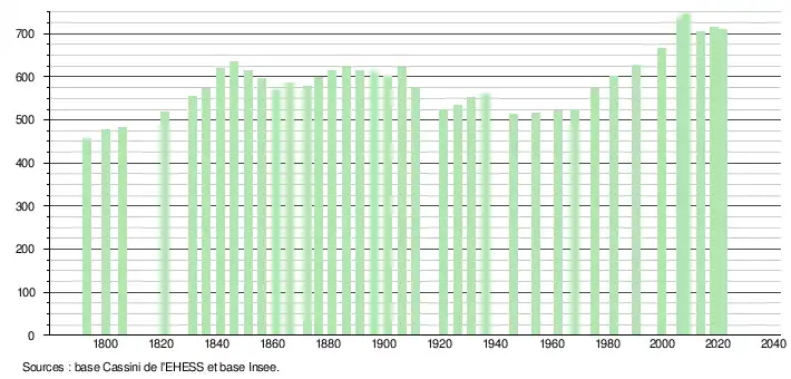 | L'évolution du nombre d'habitants est connue à travers les recensements de la population effectués dans la commune depuis 1793. Pour les communes de moins de 10 000 habitants, une enquête de recensement portant sur toute la population est réalisée tous les cinq ans, les populations légales des années intermédiaires étant quant à elles estimées par interpolation ou extrapolation[34]. Pour la commune, le premier recensement exhaustif entrant dans le cadre du nouveau dispositif a été réalisé en 2008[35]. En 2021, la commune comptait 709 habitants[Note 3], en diminution de 1,94 % par rapport à 2015 (Landes : +4,9 %, France hors Mayotte : +1,84 %). |
