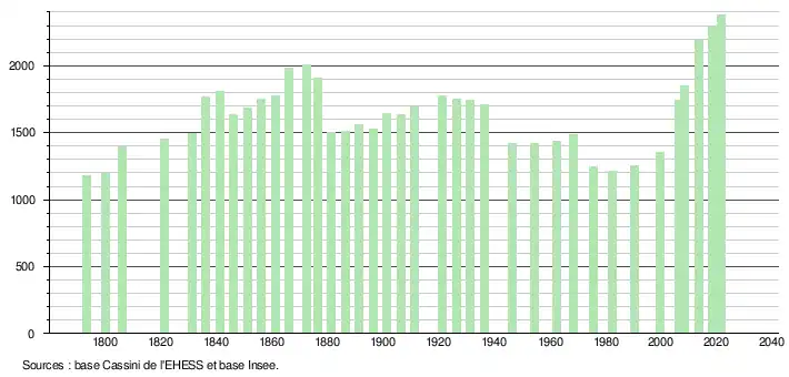 | L'évolution du nombre d'habitants est connue à travers les recensements de la population effectués dans la commune depuis 1793. Pour les communes de moins de 10 000 habitants, une enquête de recensement portant sur toute la population est réalisée tous les cinq ans, les populations légales des années intermédiaires étant quant à elles estimées par interpolation ou extrapolation[33]. Pour la commune, le premier recensement exhaustif entrant dans le cadre du nouveau dispositif a été réalisé en 2008[34]. En 2021, la commune comptait 2 378 habitants[Note 8], en augmentation de 6,11 % par rapport à 2015 (Hérault : +7,29 %, France hors Mayotte : +1,84 %). |