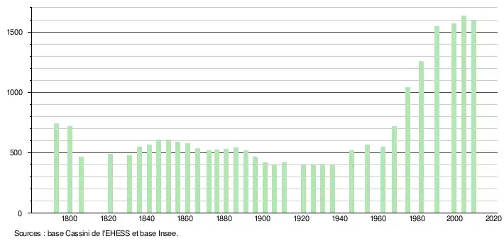 - Dans le tableau des recensements et le graphique, par convention dans Wikipédia, le principe a été retenu, pour les populations légales postérieures à 1999 de n’afficher dans le tableau des recensements et le graphique que les populations correspondant à l'année 2006, première population légale publiée calculée conformément aux concepts définis dans le décret no 2003-485 du 5 juin 2003, et les années correspondant à une enquête exhaustive de recensement pour les communes de moins de 10 000 habitants, ainsi que la dernière population légale publiée par l’Insee.