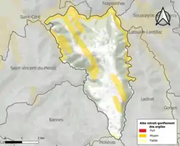 Le retrait-gonflement des sols argileux est susceptible d'engendrer des dommages importants aux bâtiments en cas d’alternance de périodes de sécheresse et de pluie. 26,9 % de la superficie communale est en aléa moyen ou fort (67,7 % au niveau départemental et 48,5 % au niveau national). Sur les 113 bâtiments dénombrés sur la commune en 2019, 48 sont en aléa moyen ou fort, soit 42 %, à comparer aux 72 % au niveau départemental et 54 % au niveau national. Une cartographie de l'exposition du territoire national au retrait gonflement des sols argileux est disponible sur le site du BRGM[24],[Carte 2].