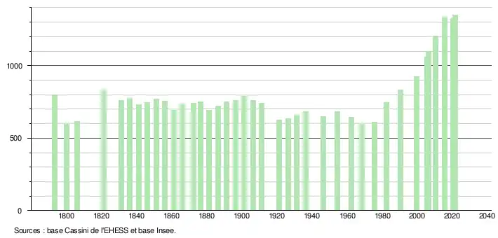 L'évolution du nombre d'habitants est connue à travers les recensements de la population effectués dans la commune depuis 1793. Pour les communes de moins de 10 000 habitants, une enquête de recensement portant sur toute la population est réalisée tous les cinq ans, les populations légales des années intermédiaires étant quant à elles estimées par interpolation ou extrapolation[18]. Pour la commune, le premier recensement exhaustif entrant dans le cadre du nouveau dispositif a été réalisé en 2005[19].