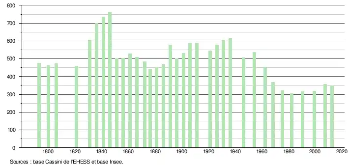L'évolution du nombre d'habitants est connue à travers les recensements de la population effectués dans la commune depuis 1793. À partir du , les populations légales des communes sont publiées annuellement dans le cadre d'un recensement qui repose désormais sur une collecte d'information annuelle, concernant successivement tous les territoires communaux au cours d'une période de cinq ans. Pour les communes de moins de 10 000 habitants, une enquête de recensement portant sur toute la population est réalisée tous les cinq ans, les populations légales des années intermédiaires étant quant à elles estimées par interpolation ou extrapolation[4]. Pour la commune, le premier recensement exhaustif entrant dans le cadre du nouveau dispositif a été réalisé en 2007[5],[Note 1].