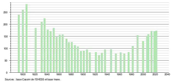 L'évolution du nombre d'habitants est connue à travers les recensements de la population effectués dans la commune depuis 1793. Pour les communes de moins de 10 000 habitants, une enquête de recensement portant sur toute la population est réalisée tous les cinq ans, les populations légales des années intermédiaires étant quant à elles estimées par interpolation ou extrapolation[21]. Pour la commune, le premier recensement exhaustif entrant dans le cadre du nouveau dispositif a été réalisé en 2008[22].