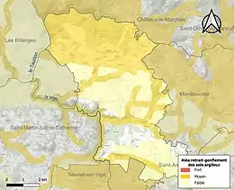 Le retrait-gonflement des sols argileux est susceptible d'engendrer des dommages importants aux bâtiments en cas d’alternance de périodes de sécheresse et de pluie. 54,5 % de la superficie communale est en aléa moyen ou fort (33,6 % au niveau départemental et 48,5 % au niveau national). Sur les 148 bâtiments dénombrés sur la commune en 2019, 74 sont en aléa moyen ou fort, soit 50 %, à comparer aux 25 % au niveau départemental et 54 % au niveau national. Une cartographie de l'exposition du territoire national au retrait gonflement des sols argileux est disponible sur le site du BRGM[17],[Carte 2].