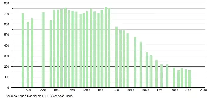 L'évolution du nombre d'habitants est connue à travers les recensements de la population effectués dans la commune depuis 1793. Pour les communes de moins de 10 000 habitants, une enquête de recensement portant sur toute la population est réalisée tous les cinq ans, les populations légales des années intermédiaires étant quant à elles estimées par interpolation ou extrapolation[24]. Pour la commune, le premier recensement exhaustif entrant dans le cadre du nouveau dispositif a été réalisé en 2005[25].