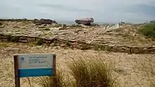 - La pointe de Beg-En-Aud[Note 7], connue pour son éperon barré attribué aux Vénètes qui l'utilisèrent comme camp retranché à l'époque gallo-romaine, d'où le folklore local qui en fait le village d'Astérix résistant à Jules César pendant la guerre des Vénètes[8]. Le tumulus mesurant 50 mètres de long et 5 mètres de haut pourrait être une tombe scandinave et a servi de talus de défense aux habitants de la pointe[15]. Le site a livré des silex attribués initialement au Néolithique. La prospection d'un locus a permis d'identifier un atelier de débitage[Note 8] daté de la fin du Mésolithique, comme à Téviec[16]. Sur ce site, il existe un four à goémon encore parfaitement intact. Les deux autres fours à goémons de la presqu'île sont reconstitués de part et d’autre du sentier de la pointe du Conguel[17].