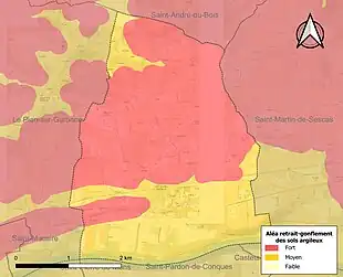 Le retrait-gonflement des sols argileux est susceptible d'engendrer des dommages importants aux bâtiments en cas d’alternance de périodes de sécheresse et de pluie. La totalité de la commune est en aléa moyen ou fort (67,4 % au niveau départemental et 48,5 % au niveau national). Sur les 632 bâtiments dénombrés sur la commune en 2019, 632 sont en aléa moyen ou fort, soit 100 %, à comparer aux 84 % au niveau départemental et 54 % au niveau national. Une cartographie de l'exposition du territoire national au retrait gonflement des sols argileux est disponible sur le site du BRGM[24],[Carte 2].