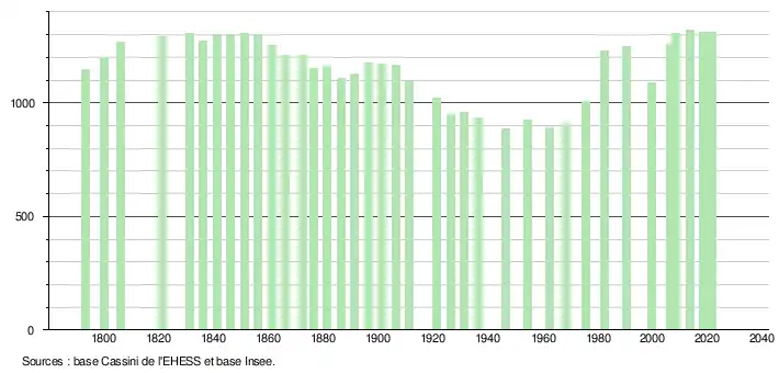 | L'évolution du nombre d'habitants est connue à travers les recensements de la population effectués dans la commune depuis 1793. Pour les communes de moins de 10 000 habitants, une enquête de recensement portant sur toute la population est réalisée tous les cinq ans, les populations légales des années intermédiaires étant quant à elles estimées par interpolation ou extrapolation[36]. Pour la commune, le premier recensement exhaustif entrant dans le cadre du nouveau dispositif a été réalisé en 2008[37]. En 2021, la commune comptait 1 309 habitants[Note 6], en diminution de 2,17 % par rapport à 2015 (Gironde : +6,88 %, France hors Mayotte : +1,84 %). |