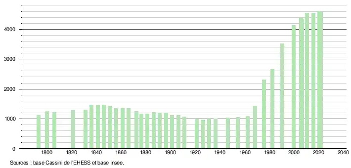 L'évolution du nombre d'habitants est connue à travers les recensements de la population effectués dans la commune depuis 1793. Pour les communes de moins de 10 000 habitants, une enquête de recensement portant sur toute la population est réalisée tous les cinq ans, les populations légales des années intermédiaires étant quant à elles estimées par interpolation ou extrapolation[23]. Pour la commune, le premier recensement exhaustif entrant dans le cadre du nouveau dispositif a été réalisé en 2005[24].