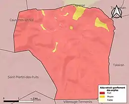 Le retrait-gonflement des sols argileux est susceptible d'engendrer des dommages importants aux bâtiments en cas d’alternance de périodes de sécheresse et de pluie. La totalité de la commune est en aléa moyen ou fort (75,2 % au niveau départemental et 48,5 % au niveau national). Sur les 173 bâtiments dénombrés sur la commune en 2019, 173 sont en aléa moyen ou fort, soit 100 %, à comparer aux 94 % au niveau départemental et 54 % au niveau national. Une cartographie de l'exposition du territoire national au retrait gonflement des sols argileux est disponible sur le site du BRGM[26],[Carte 3].
