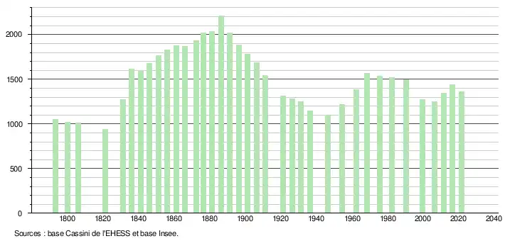 L'évolution du nombre d'habitants est connue à travers les recensements de la population effectués dans la commune depuis 1793. Pour les communes de moins de 10 000 habitants, une enquête de recensement portant sur toute la population est réalisée tous les cinq ans, les populations légales des années intermédiaires étant quant à elles estimées par interpolation ou extrapolation[21]. Pour la commune, le premier recensement exhaustif entrant dans le cadre du nouveau dispositif a été réalisé en 2006[22].