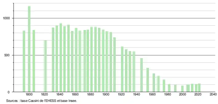 L'évolution du nombre d'habitants est connue à travers les recensements de la population effectués dans la commune depuis 1793. Pour les communes de moins de 10 000 habitants, une enquête de recensement portant sur toute la population est réalisée tous les cinq ans, les populations légales des années intermédiaires étant quant à elles estimées par interpolation ou extrapolation[20]. Pour la commune, le premier recensement exhaustif entrant dans le cadre du nouveau dispositif a été réalisé en 2007[21].