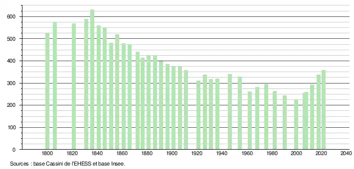 L'évolution du nombre d'habitants est connue à travers les recensements de la population effectués dans la commune depuis 1800. Pour les communes de moins de 10 000 habitants, une enquête de recensement portant sur toute la population est réalisée tous les cinq ans, les populations légales des années intermédiaires étant quant à elles estimées par interpolation ou extrapolation[26]. Pour la commune, le premier recensement exhaustif entrant dans le cadre du nouveau dispositif a été réalisé en 2007[27].