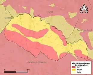 Le retrait-gonflement des sols argileux est susceptible d'engendrer des dommages importants aux bâtiments en cas d’alternance de périodes de sécheresse et de pluie[19]. La totalité de la commune est en aléa moyen ou fort (91,8 % au niveau départemental et 48,5 % au niveau national)[Carte 2]. Depuis le , en application de la loi ELAN, différentes contraintes s'imposent aux vendeurs, maîtres d'ouvrages ou constructeurs de biens situés dans une zone classée en aléa moyen ou fort[Note 2],[20].