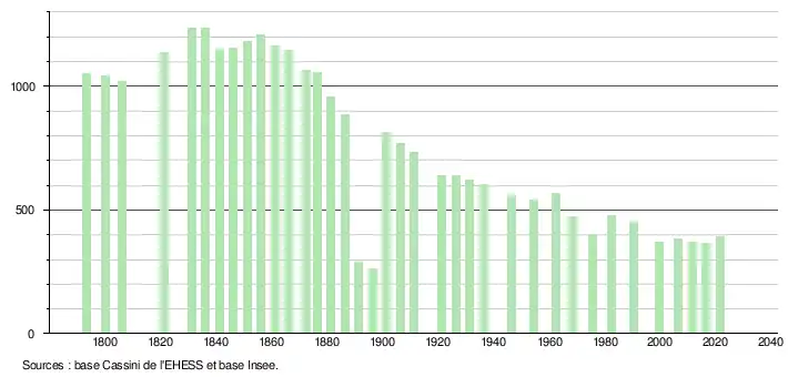L'évolution du nombre d'habitants est connue à travers les recensements de la population effectués dans la commune depuis 1793. Pour les communes de moins de 10 000 habitants, une enquête de recensement portant sur toute la population est réalisée tous les cinq ans, les populations légales des années intermédiaires étant quant à elles estimées par interpolation ou extrapolation[31]. Pour la commune, le premier recensement exhaustif entrant dans le cadre du nouveau dispositif a été réalisé en 2006[32].