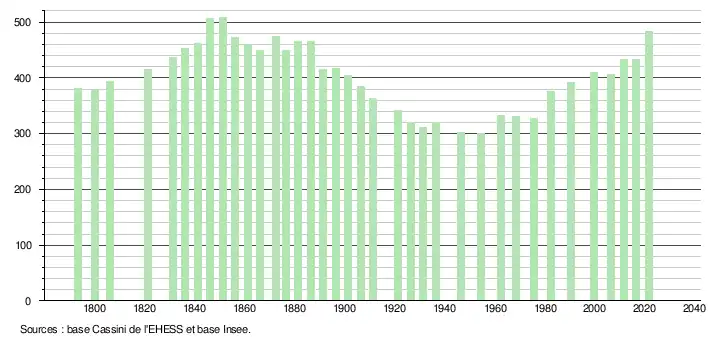 L'évolution du nombre d'habitants est connue à travers les recensements de la population effectués dans la commune depuis 1793. Pour les communes de moins de 10 000 habitants, une enquête de recensement portant sur toute la population est réalisée tous les cinq ans, les populations légales des années intermédiaires étant quant à elles estimées par interpolation ou extrapolation[20]. Pour la commune, le premier recensement exhaustif entrant dans le cadre du nouveau dispositif a été réalisé en 2006[21].