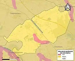 Le retrait-gonflement des sols argileux est susceptible d'engendrer des dommages importants aux bâtiments en cas d’alternance de périodes de sécheresse et de pluie. La totalité de la commune est en aléa moyen ou fort (92 % au niveau départemental et 48,5 % au niveau national). Sur les 526 bâtiments dénombrés sur la commune en 2019, 526 sont en aléa moyen ou fort, soit 100 %, à comparer aux 96 % au niveau départemental et 54 % au niveau national. Une cartographie de l'exposition du territoire national au retrait gonflement des sols argileux est disponible sur le site du BRGM[36],[Carte 3].