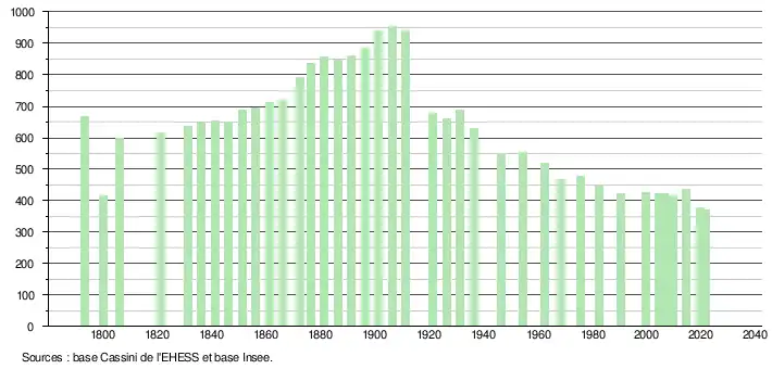 L'évolution du nombre d'habitants est connue à travers les recensements de la population effectués dans la commune depuis 1793. Pour les communes de moins de 10 000 habitants, une enquête de recensement portant sur toute la population est réalisée tous les cinq ans, les populations légales des années intermédiaires étant quant à elles estimées par interpolation ou extrapolation[19]. Pour la commune, le premier recensement exhaustif entrant dans le cadre du nouveau dispositif a été réalisé en 2004[20].