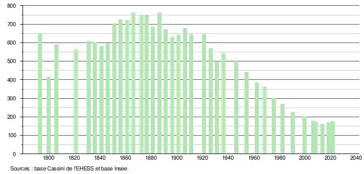 L'évolution du nombre d'habitants est connue à travers les recensements de la population effectués dans la commune depuis 1793. Pour les communes de moins de 10 000 habitants, une enquête de recensement portant sur toute la population est réalisée tous les cinq ans, les populations légales des années intermédiaires étant quant à elles estimées par interpolation ou extrapolation[18]. Pour la commune, le premier recensement exhaustif entrant dans le cadre du nouveau dispositif a été réalisé en 2008[19].