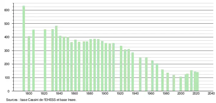 L'évolution du nombre d'habitants est connue à travers les recensements de la population effectués dans la commune depuis 1793. Pour les communes de moins de 10 000 habitants, une enquête de recensement portant sur toute la population est réalisée tous les cinq ans, les populations légales des années intermédiaires étant quant à elles estimées par interpolation ou extrapolation[14]. Pour la commune, le premier recensement exhaustif entrant dans le cadre du nouveau dispositif a été réalisé en 2008[15].