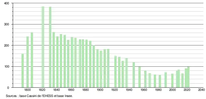 L'évolution du nombre d'habitants est connue à travers les recensements de la population effectués dans la commune depuis 1793. Pour les communes de moins de 10 000 habitants, une enquête de recensement portant sur toute la population est réalisée tous les cinq ans, les populations légales des années intermédiaires étant quant à elles estimées par interpolation ou extrapolation[15]. Pour la commune, le premier recensement exhaustif entrant dans le cadre du nouveau dispositif a été réalisé en 2008[16].
