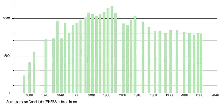 L'évolution du nombre d'habitants est connue à travers les recensements de la population effectués dans la commune depuis 1793. Pour les communes de moins de 10 000 habitants, une enquête de recensement portant sur toute la population est réalisée tous les cinq ans, les populations légales des années intermédiaires étant quant à elles estimées par interpolation ou extrapolation[20]. Pour la commune, le premier recensement exhaustif entrant dans le cadre du nouveau dispositif a été réalisé en 2007[21].