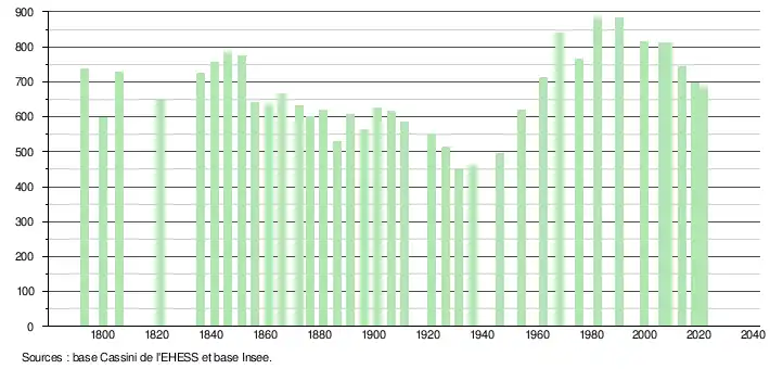L'évolution du nombre d'habitants est connue à travers les recensements de la population effectués dans la commune depuis 1793. Pour les communes de moins de 10 000 habitants, une enquête de recensement portant sur toute la population est réalisée tous les cinq ans, les populations légales des années intermédiaires étant quant à elles estimées par interpolation ou extrapolation[14]. Pour la commune, le premier recensement exhaustif entrant dans le cadre du nouveau dispositif a été réalisé en 2008[15].