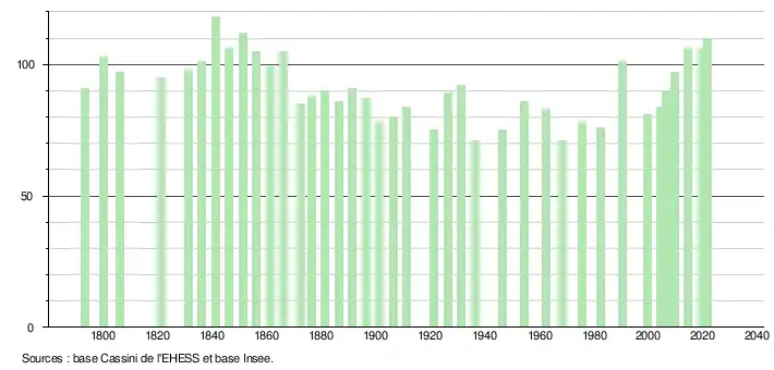 L'évolution du nombre d'habitants est connue à travers les recensements de la population effectués dans la commune depuis 1793. Pour les communes de moins de 10 000 habitants, une enquête de recensement portant sur toute la population est réalisée tous les cinq ans, les populations légales des années intermédiaires étant quant à elles estimées par interpolation ou extrapolation[19]. Pour la commune, le premier recensement exhaustif entrant dans le cadre du nouveau dispositif a été réalisé en 2004[20].