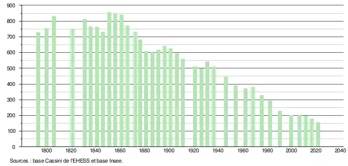 L'évolution du nombre d'habitants est connue à travers les recensements de la population effectués dans la commune depuis 1793. Pour les communes de moins de 10 000 habitants, une enquête de recensement portant sur toute la population est réalisée tous les cinq ans, les populations légales des années intermédiaires étant quant à elles estimées par interpolation ou extrapolation[22]. Pour la commune, le premier recensement exhaustif entrant dans le cadre du nouveau dispositif a été réalisé en 2006[23].