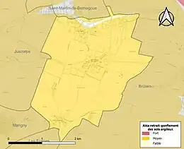 Les mouvements de terrains susceptibles de se produire sur la commune sont des tassements différentiels[17]. Le retrait-gonflement des sols argileux est susceptible d'engendrer des dommages importants aux bâtiments en cas d’alternance de périodes de sécheresse et de pluie[18]. 98,5 % de la superficie communale est en aléa moyen ou fort (54,9 % au niveau départemental et 48,5 % au niveau national)[Carte 2]. Depuis le , en application de la loi ELAN, différentes contraintes s'imposent aux vendeurs, maîtres d'ouvrages ou constructeurs de biens situés dans une zone classée en aléa moyen ou fort[Note 3],[19].