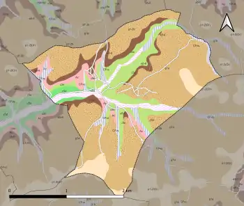 L'occupation des sols de la commune, telle qu'elle ressort de la base de données européenne d’occupation biophysique des sols Corine Land Cover (CLC), est marquée par l'importance des forêts et milieux semi-naturels (74,3 % en 2018), une proportion identique à celle de 1990 (74,3 %). La répartition détaillée en 2018 est la suivante : forêts (74,3 %), zones agricoles hétérogènes (13,5 %), prairies (12,2 %)[33]. L'évolution de l’occupation des sols de la commune et de ses infrastructures peut être observée sur les différentes représentations cartographiques du territoire : la carte de Cassini (XVIIIe siècle), la carte d'état-major (1820-1866) et les cartes ou photos aériennes de l'IGN pour la période actuelle (1950 à aujourd'hui)[Carte 3].