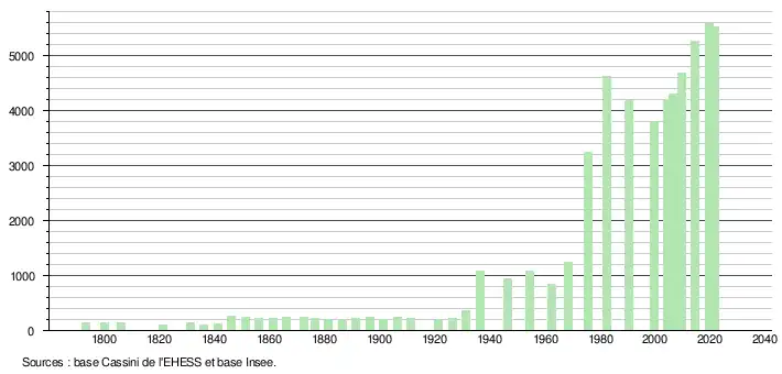 L'évolution du nombre d'habitants est connue à travers les recensements de la population effectués dans la commune depuis 1793. Pour les communes de moins de 10 000 habitants, une enquête de recensement portant sur toute la population est réalisée tous les cinq ans, les populations légales des années intermédiaires étant quant à elles estimées par interpolation ou extrapolation[30]. Pour la commune, le premier recensement exhaustif entrant dans le cadre du nouveau dispositif a été réalisé en 2004[31].