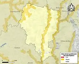Le retrait-gonflement des sols argileux est susceptible d'engendrer des dommages importants aux bâtiments en cas d’alternance de périodes de sécheresse et de pluie. 21,4 % de la superficie communale est en aléa moyen ou fort (26,8 % au niveau départemental et 48,5 % au niveau national). Sur les 257 bâtiments dénombrés sur la commune en 2019, 3 sont en aléa moyen ou fort, soit 1 %, à comparer aux 36 % au niveau départemental et 54 % au niveau national. Une cartographie de l'exposition du territoire national au retrait gonflement des sols argileux est disponible sur le site du BRGM[16],[Carte 2].