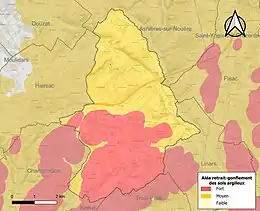 Le retrait-gonflement des sols argileux est susceptible d'engendrer des dommages importants aux bâtiments en cas d’alternance de périodes de sécheresse et de pluie. La totalité de la commune est en aléa moyen ou fort (67,4 % au niveau départemental et 48,5 % au niveau national). Sur les 594 bâtiments dénombrés sur la commune en 2019, 594 sont en aléa moyen ou fort, soit 100 %, à comparer aux 81 % au niveau départemental et 54 % au niveau national. Une cartographie de l'exposition du territoire national au retrait gonflement des sols argileux est disponible sur le site du BRGM[20],[Carte 3].
