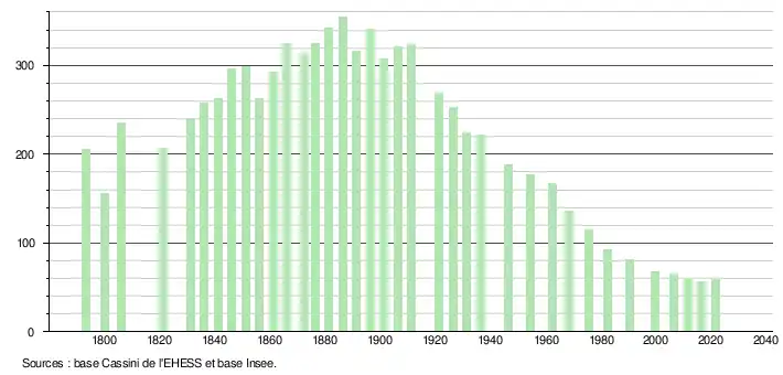 L'évolution du nombre d'habitants est connue à travers les recensements de la population effectués dans la commune depuis 1793. Pour les communes de moins de 10 000 habitants, une enquête de recensement portant sur toute la population est réalisée tous les cinq ans, les populations légales des années intermédiaires étant quant à elles estimées par interpolation ou extrapolation[20]. Pour la commune, le premier recensement exhaustif entrant dans le cadre du nouveau dispositif a été réalisé en 2006[21].