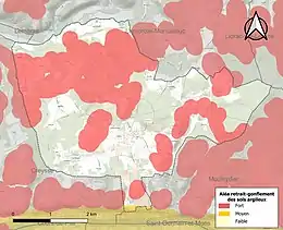 Les mouvements de terrains susceptibles de se produire sur la commune sont des tassements différentiels[44]. Le retrait-gonflement des sols argileux est susceptible d'engendrer des dommages importants aux bâtiments en cas d’alternance de périodes de sécheresse et de pluie[45]. 44,9 % de la superficie communale est en aléa moyen ou fort (58,6 % au niveau départemental et 48,5 % au niveau national métropolitain)[Carte 4]. Depuis le , en application de la loi ÉLAN, différentes contraintes s'imposent aux vendeurs, maîtres d'ouvrages ou constructeurs de biens situés dans une zone classée en aléa moyen ou fort[Note 5],[46].