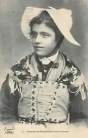 Le costume traditionnel féminin se compose d'une coiffe ou béguine, d'une robe, d'un corselet, des manches, de la jupe, de la ceinture, du tablier, d'un châle, de la chemise ou du chemisier, de bas et de chaussures et de bijoux (cœurs et croix). Les hommes, eux portent une veste en laine[31].
