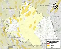 Le retrait-gonflement des sols argileux est susceptible d'engendrer des dommages importants aux bâtiments en cas d’alternance de périodes de sécheresse et de pluie[19]. 10,8 % de la superficie communale est en aléa moyen ou fort (27 % au niveau départemental et 48,5 % au niveau national métropolitain)[Carte 2]. Depuis le , en application de la loi ÉLAN, différentes contraintes s'imposent aux vendeurs, maîtres d'ouvrages ou constructeurs de biens situés dans une zone classée en aléa moyen ou fort[Note 2],[20].