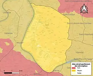 Le retrait-gonflement des sols argileux est susceptible d'engendrer des dommages importants aux bâtiments en cas d’alternance de périodes de sécheresse et de pluie. 99,9 % de la superficie communale est en aléa moyen ou fort (67,4 % au niveau départemental et 48,5 % au niveau national). Sur les 692 bâtiments dénombrés sur la commune en 2019, 692 sont en aléa moyen ou fort, soit 100 %, à comparer aux 84 % au niveau départemental et 54 % au niveau national. Une cartographie de l'exposition du territoire national au retrait gonflement des sols argileux est disponible sur le site du BRGM[30],[Carte 2].