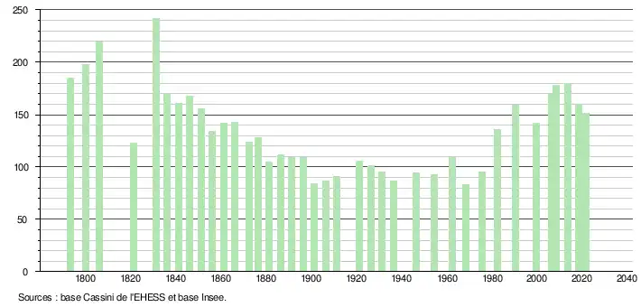 L'évolution du nombre d'habitants est connue à travers les recensements de la population effectués dans la commune depuis 1793. Pour les communes de moins de 10 000 habitants, une enquête de recensement portant sur toute la population est réalisée tous les cinq ans, les populations légales des années intermédiaires étant quant à elles estimées par interpolation ou extrapolation[20]. Pour la commune, le premier recensement exhaustif entrant dans le cadre du nouveau dispositif a été réalisé en 2008[21].