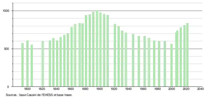 L'évolution du nombre d'habitants est connue à travers les recensements de la population effectués dans la commune depuis 1793. Pour les communes de moins de 10 000 habitants, une enquête de recensement portant sur toute la population est réalisée tous les cinq ans, les populations légales des années intermédiaires étant quant à elles estimées par interpolation ou extrapolation[18]. Pour la commune, le premier recensement exhaustif entrant dans le cadre du nouveau dispositif a été réalisé en 2007[19].