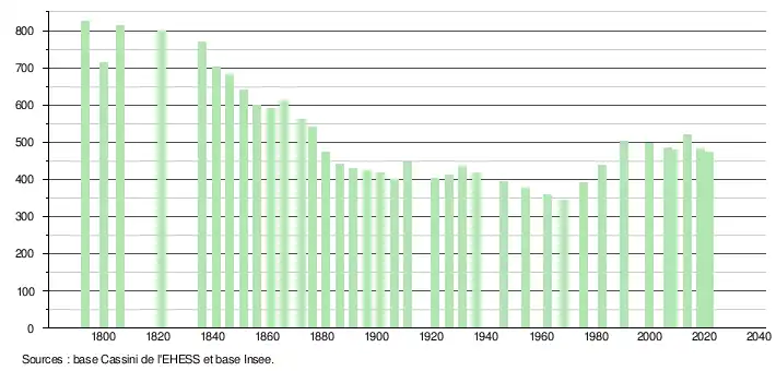 L'évolution du nombre d'habitants est connue à travers les recensements de la population effectués dans la commune depuis 1793. Pour les communes de moins de 10 000 habitants, une enquête de recensement portant sur toute la population est réalisée tous les cinq ans, les populations légales des années intermédiaires étant quant à elles estimées par interpolation ou extrapolation[22]. Pour la commune, le premier recensement exhaustif entrant dans le cadre du nouveau dispositif a été réalisé en 2008[23].