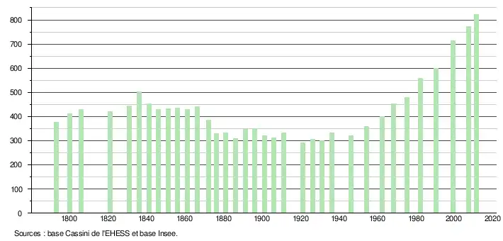 - Dans le tableau des recensements et le graphique, par convention dans Wikipédia, le principe a été retenu, pour les populations légales postérieures à 1999 de n’afficher dans le tableau des recensements et le graphique que les populations correspondant à l'année 2006, première population légale publiée calculée conformément aux concepts définis dans le décret no 2003-485 du 5 juin 2003, et les années correspondant à une enquête exhaustive de recensement pour les communes de moins de 10 000 habitants, ainsi que la dernière population légale publiée par l’Insee.