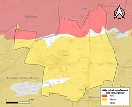 Les mouvements de terrains susceptibles de se produire sur la commune sont des tassements différentiels[18]. Le retrait-gonflement des sols argileux est susceptible d'engendrer des dommages importants aux bâtiments en cas d’alternance de périodes de sécheresse et de pluie[19]. 93,4 % de la superficie communale est en aléa moyen ou fort (54,9 % au niveau départemental et 48,5 % au niveau national)[Carte 2]. Depuis le , en application de la loi ELAN, différentes contraintes s'imposent aux vendeurs, maîtres d'ouvrages ou constructeurs de biens situés dans une zone classée en aléa moyen ou fort[Note 3],[20].