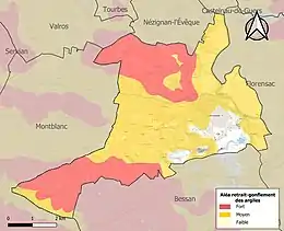 Le retrait-gonflement des sols argileux est susceptible d'engendrer des dommages importants aux bâtiments en cas d’alternance de périodes de sécheresse et de pluie. 91,2 % de la superficie communale est en aléa moyen ou fort (59,3 % au niveau départemental et 48,5 % au niveau national). Sur les 1 243 bâtiments dénombrés sur la commune en 2019, 897 sont en aléa moyen ou fort, soit 72 %, à comparer aux 85 % au niveau départemental et 54 % au niveau national. Une cartographie de l'exposition du territoire national au retrait gonflement des sols argileux est disponible sur le site du BRGM[24],[Carte 2].