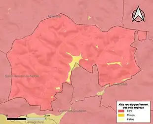 Le retrait-gonflement des sols argileux est susceptible d'engendrer des dommages importants aux bâtiments en cas d’alternance de périodes de sécheresse et de pluie[19]. La totalité de la commune est en aléa moyen ou fort (91,8 % au niveau départemental et 48,5 % au niveau national)[Carte 2]. Depuis le , en application de la loi ELAN, différentes contraintes s'imposent aux vendeurs, maîtres d'ouvrages ou constructeurs de biens situés dans une zone classée en aléa moyen ou fort[Note 3],[20].