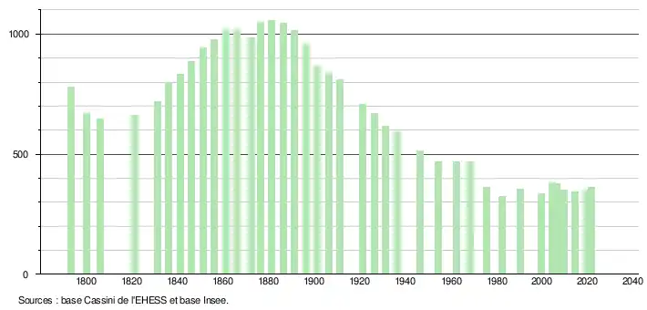 L'évolution du nombre d'habitants est connue à travers les recensements de la population effectués dans la commune depuis 1793. Pour les communes de moins de 10 000 habitants, une enquête de recensement portant sur toute la population est réalisée tous les cinq ans, les populations légales des années intermédiaires étant quant à elles estimées par interpolation ou extrapolation[22]. Pour la commune, le premier recensement exhaustif entrant dans le cadre du nouveau dispositif a été réalisé en 2004[23].