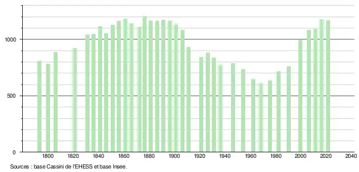 L'évolution du nombre d'habitants est connue à travers les recensements de la population effectués dans la commune depuis 1793. Pour les communes de moins de 10 000 habitants, une enquête de recensement portant sur toute la population est réalisée tous les cinq ans, les populations légales des années intermédiaires étant quant à elles estimées par interpolation ou extrapolation[18]. Pour la commune, le premier recensement exhaustif entrant dans le cadre du nouveau dispositif a été réalisé en 2006[19].
